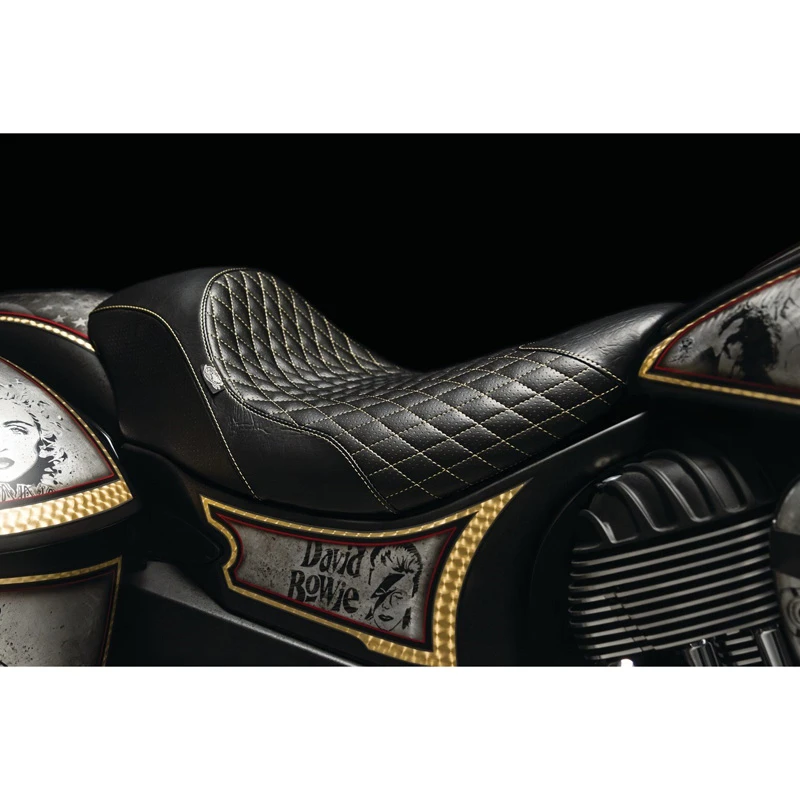 The Dirty Bird teamed up with Mustang to develop the new John Shope Signature Series designed exclusively for Indian Motorcycle. The 11.5″ wide café-inspired seat features double-stitched, high quality vinyl with a perforated diamond-stitched center panel for custom flair. The low profile design delivers a streamlined appearance and sits the rider in an aggressive yet comfortable position.