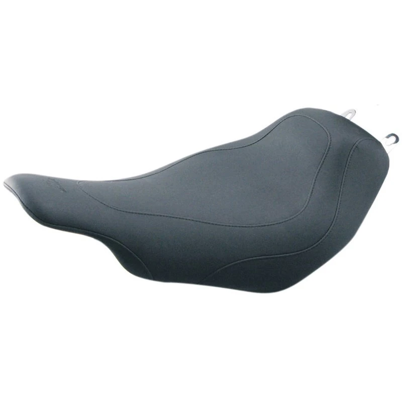 The edges of all baseplates have a steel reinforced, impact absorbing vinyl edge trim to protect the seat cover. Polyurethane bumpers are strategically located and riveted to the baseplate to prevent it from touching the frame and fender and to minimize vibration. Mustang’s unique internal support wings are added to the baseplate to provide maximum driver and passenger comfort. These wings support the entire width of the molded foam. This feature is found on most Mustang touring seats. Bumpers will not crack with age and are ozone protected. Solos with built-in driver backrests have the receiver welded and reinforced to the baseplate for strength. Foam surrounds the hardware to provide maximum comfort.