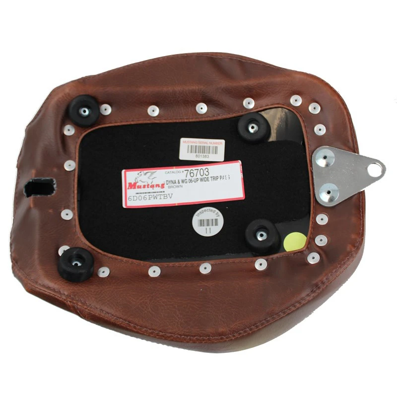 The edges of all baseplates have a steel reinforced, impact absorbing vinyl edge trim to protect the seat cover. Polyurethane bumpers are strategically located and riveted to the baseplate to prevent it from touching the frame and fender and to minimize vibration. Mustang’s unique internal support wings are added to the baseplate to provide maximum driver and passenger comfort. These wings support the entire width of the molded foam. This feature is found on most Mustang touring seats. Bumpers will not crack with age and are ozone protected. Solos with built-in driver backrests have the receiver welded and reinforced to the baseplate for strength. Foam surrounds the hardware to provide maximum comfort.