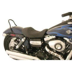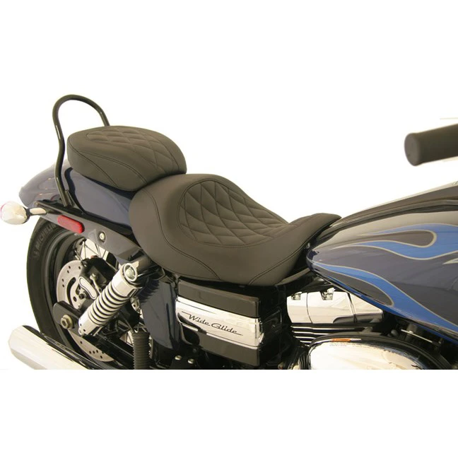 All baseplates for these seats are made of marine-grade, 3/16″ thick fiberglass, finished in high gloss gel coat. All brackets are riveted in place. Exposed brackets are bright chrome plated. Polyurethane rubber bumpers are strategically located and riveted to the baseplate to prevent it from touching the frame and fender and to minimize vibration. Bumpers will not crack with age and are ozone protected. The hidden brackets have a tough, black epoxy powder coat finish and the edges of all baseplates have a steel reinforced, impact absorbing vinyl edge trim to protect the seat cover Mustang’s unique internal support wings are added to the baseplate to provide maximum driver and passenger comfort. These wings support the entire width of the molded foam. This feature is found on most Mustang touring seats. - Baseplates for Mustang Seats for Harley-Davidson®