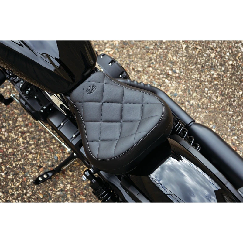 The edges of all baseplates have a steel reinforced, impact absorbing vinyl edge trim to protect the seat cover. Polyurethane bumpers are strategically located and riveted to the baseplate to prevent it from touching the frame and fender and to minimize vibration. Mustang’s unique internal support wings are added to the baseplate to provide maximum driver and passenger comfort. These wings support the entire width of the molded foam. This feature is found on most Mustang touring seats. Bumpers will not crack with age and are ozone protected. Solos with built-in driver backrests have the receiver welded and reinforced to the baseplate for strength. Foam surrounds the hardware to provide maximum comfort.