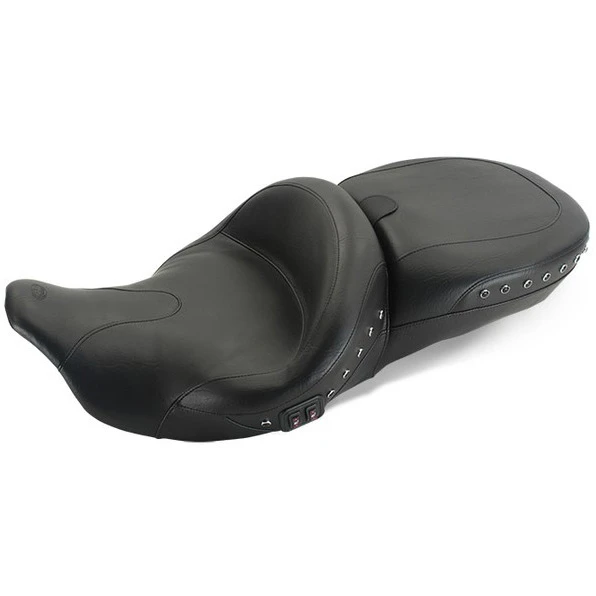 Crank up the heat on cool days for unbeatable long-haul comfort. The 19″ wide Super front bucket sits the driver 1.75″ further back than the stock seat. The passenger seat is a full 16″ wide and fits perfectly with the Rushmore speakers and Tour-Pak. Receiver for the optional driver backrest is built into the seat. Driver backrest and passenger backrest options are sold separately and do not contain heating elements. Will not work with H-D® or Mustang driver backrest kits.