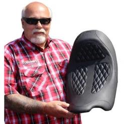 The edges of all baseplates have a steel reinforced, impact absorbing vinyl edge trim to protect the seat cover. Polyurethane bumpers are strategically located and riveted to the baseplate to prevent it from touching the frame and fender and to minimize vibration. Mustang’s unique internal support wings are added to the baseplate to provide maximum driver and passenger comfort. These wings support the entire width of the molded foam. This feature is found on most Mustang touring seats. Bumpers will not crack with age and are ozone protected. Solos with built-in driver backrests have the receiver welded and reinforced to the baseplate for strength. Foam surrounds the hardware to provide maximum comfort.