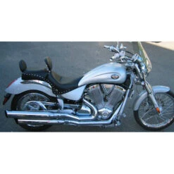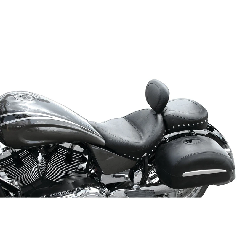 A deeply pocketed, 15.5″ wide driver bucket keeps the rider planted in a comfortable cruising position at a similar distance to the controls compared to stock. The 12″ rear seat is fully supported by Mustang’s unique internal steel wings. Available with or without a built-in driver backrest that adjusts forward and back, features a variety of height adjustments and is easily removed without tools, making it the most versatile backrest on the market. The Two-Piece Seat Standard Touring will accept Victory’s tall sissy bars, which mount into the passenger seat only.