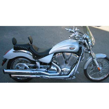 Mustang’s 79380 Standard Touring Two-Piece Seat with Backrest, Chrome Studded, Black with Conchos is made specifically for Victory Vegas/Kingpin/8-Ball models listed below.