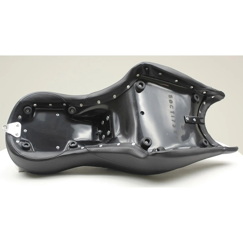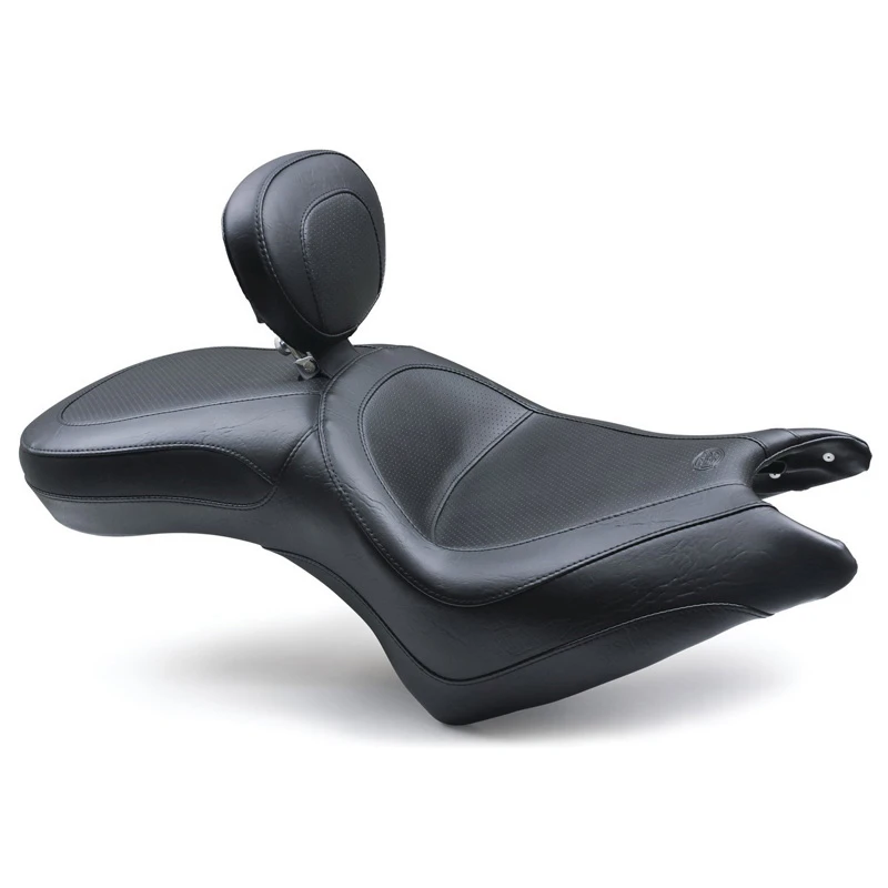 Whether racing up Pike’s Peak or just enjoying a two-up weekend ride on this “modern muscle bike,” Mustang’s touring seat enhances the comfort of the Octane’s classic cruiser riding position. Available with or without a fully adjustable and easily removable driver backrest, the driver sits into a 12.5″ wide seat with deep bucket styling for good lower back support at a similar reach to the controls compared to stock. The passenger seat is a full 10″ wide to offer comfortable 2-up cruising.