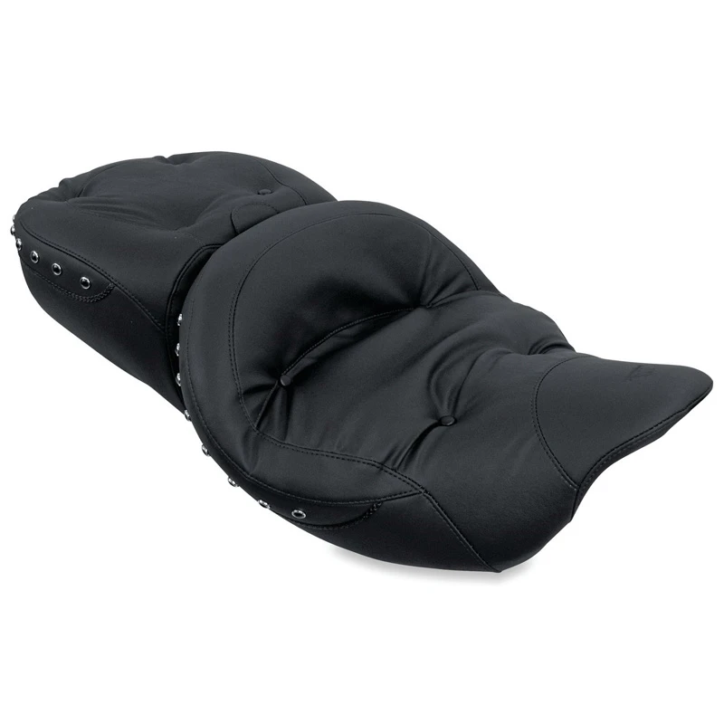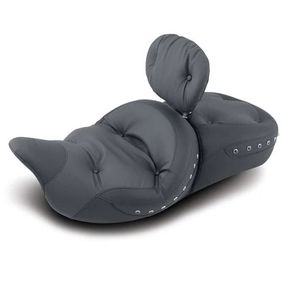 The edges of all baseplates have a steel reinforced, impact absorbing vinyl edge trim to protect the seat cover. Polyurethane bumpers are strategically located and riveted to the baseplate to prevent it from touching the frame and fender and to minimize vibration. Mustang’s unique internal support wings are added to the baseplate to provide maximum driver and passenger comfort. These wings support the entire width of the molded foam. This feature is found on most Mustang touring seats. Bumpers will not crack with age and are ozone protected. Solos with built-in driver backrests have the receiver welded and reinforced to the baseplate for strength. Foam surrounds the hardware to provide maximum comfort.