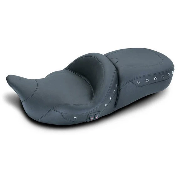 The one-piece “Super” comfortable touring design provides the rider and passenger with the fullest, most comfortable seat possible and sits the driver 1.75″ further back than the stock seat. The 19″ wide front bucket and the 14″ wide rear seat offer all-day riding comfort. Seat is available plain or with studs. The receiver for the optional fully adjustable and easily removable driver backrest is built into the seat. Mustang backrests can also be purchased later if desired. Backrests do not contain heating elements. Will not work with H-D® or Mustang driver backrest kits.