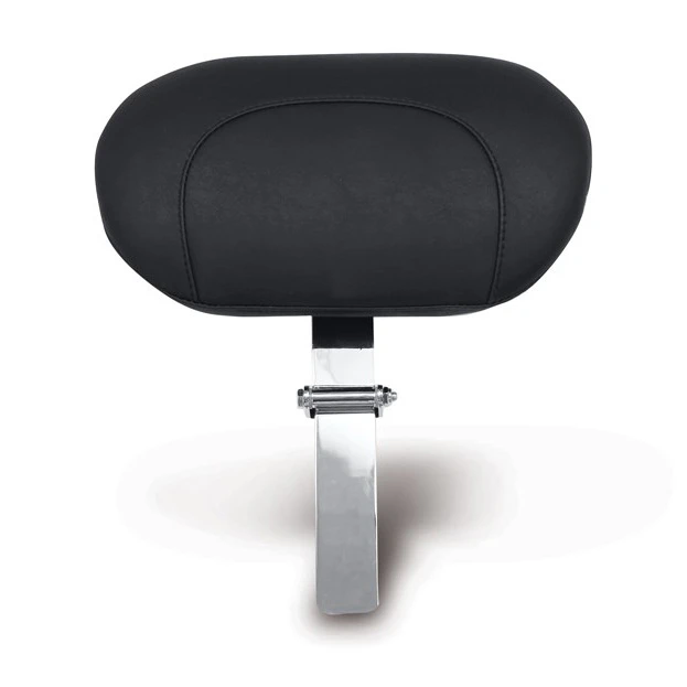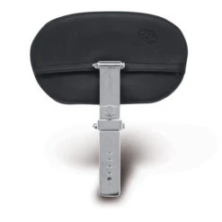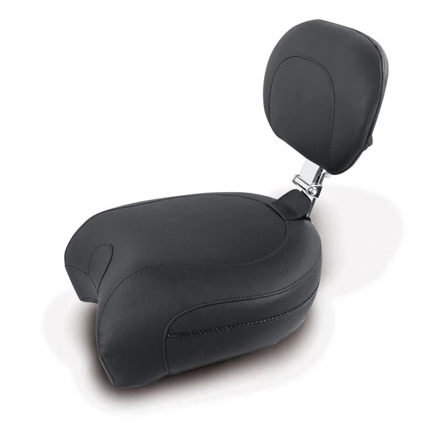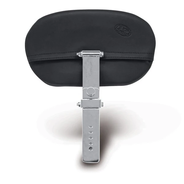 The Mustang Passenger Backrest rear seat has a recessed front end to allow clearance when being installed behind a Mustang solo with the built-in driver backrest. These rear seats come standard with the straight driver backrest post as shown in the picture; the Mustang offset backrest post (part #75099) can be used for those passengers who want to lean farther back. The backrest post can be adjusted for different height settings, and can be locked into place using the supplied knurled thumbscrew at the back of the seat. The tilt angle of the backrest pad can be adjusted forward and back using the thumbscrew on the back side of the upper post. The backrest upper can be folded flat for ease of mounting and dismounting. The passenger backrest should be folded flat when the cycle is ridden without a passenger.