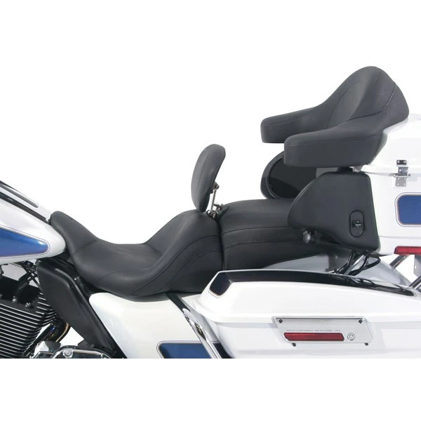 The LowDownâ„¢ Touring seat fits 2008-2015 models. The rider’s bucket is shaped and angled for optimal touring posture on the go, but it also drops you from stock position on most models, and is cut narrow at the front, so you can plant your feet firmly on the ground at a stop. This seat also provides the unsurpassed comfort of a driver backrest. The driver backrest is totally adjustable and easily removable, and is built into the seat.