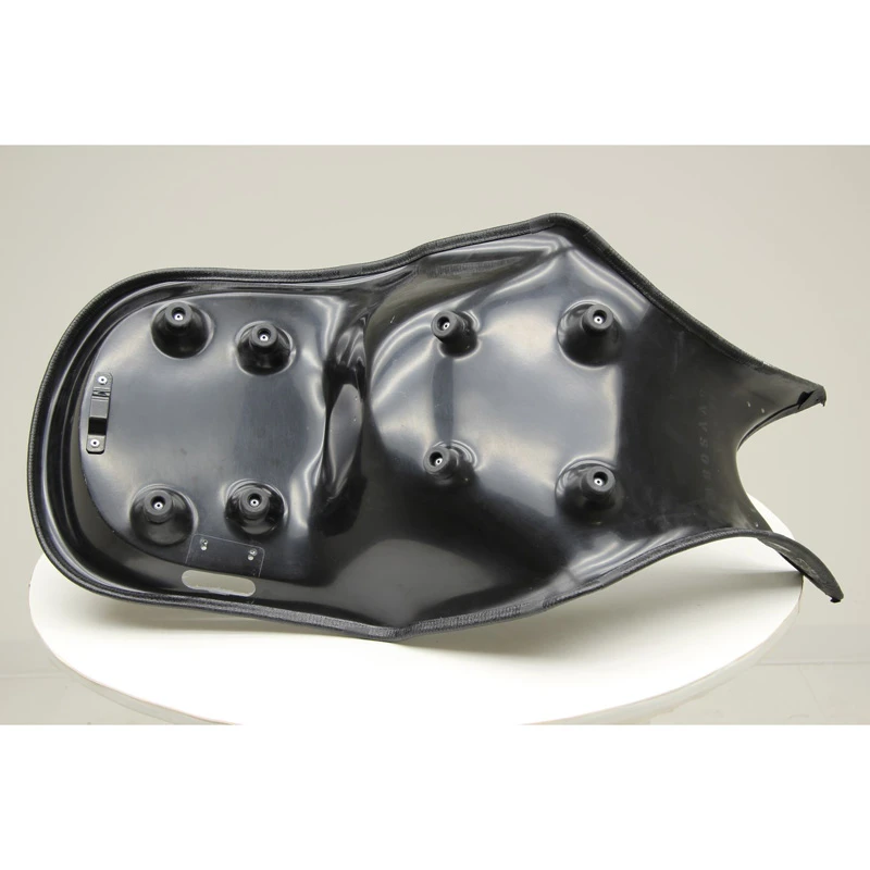 The edges of all baseplates have a steel reinforced, impact absorbing vinyl edge trim to protect the seat cover. Polyurethane bumpers are strategically located and riveted to the baseplate to prevent it from touching the frame and fender and to minimize vibration. Mustang’s unique internal support wings are added to the baseplate to provide maximum driver and passenger comfort. These wings support the entire width of the molded foam. This feature is found on most Mustang touring seats. Bumpers will not crack with age and are ozone protected. Solos with built-in driver backrests have the receiver welded and reinforced to the baseplate for strength. Foam surrounds the hardware to provide maximum comfort.