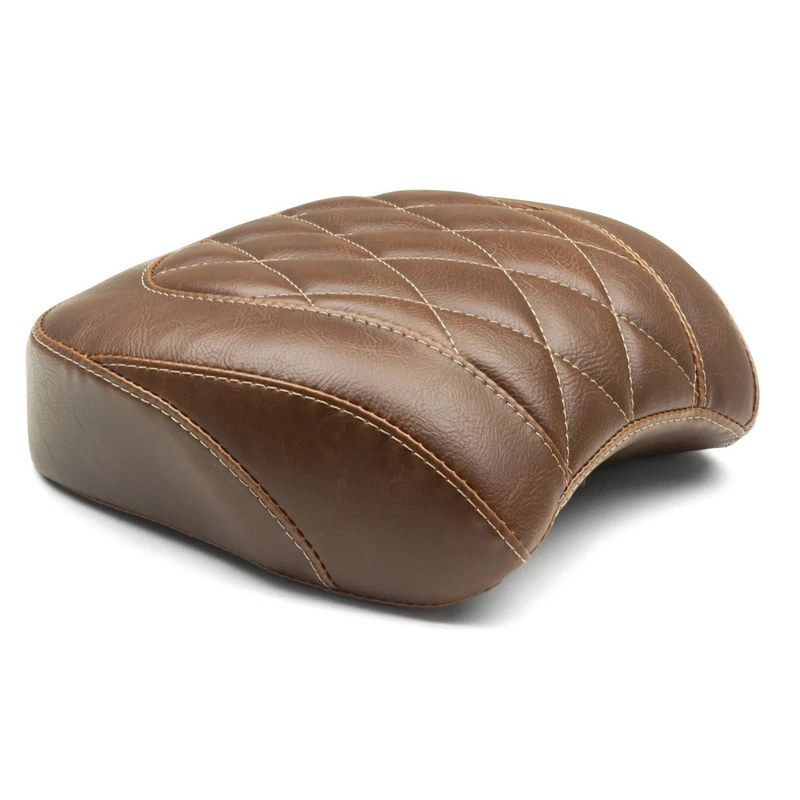 The edges of all baseplates have a steel reinforced, impact absorbing vinyl edge trim to protect the seat cover. Polyurethane bumpers are strategically located and riveted to the baseplate to prevent it from touching the frame and fender and to minimize vibration. Mustang’s unique internal support wings are added to the baseplate to provide maximum driver and passenger comfort. These wings support the entire width of the molded foam. This feature is found on most Mustang touring seats. Bumpers will not crack with age and are ozone protected. Solos with built-in driver backrests have the receiver welded and reinforced to the baseplate for strength. Foam surrounds the hardware to provide maximum comfort.