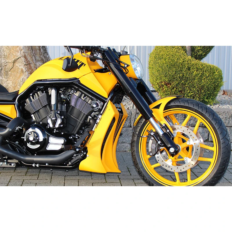 Easy to install bike specific fitment for 2002-up V-ROD. Highest quality Fiberglass German construction which is custom made for you. Includes Spoiler/Fairing, mounting kit and metal grill. This unique style will set you apart from the crowd and will add class to your V-ROD. Place your online order today or call us. Also have matching front and rear fenders.