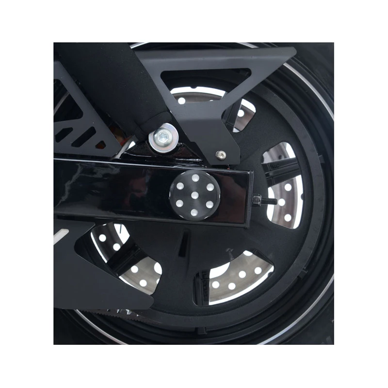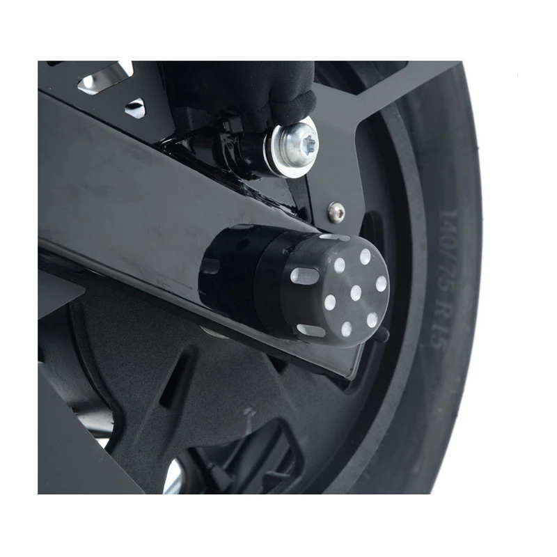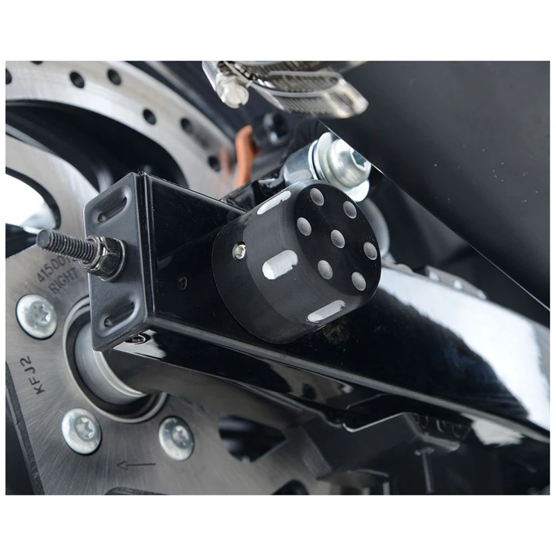 Let this set of swingarm protectors prevent damage incurred from a drop, slide or crash. These two pucks not only help keep the vital rear brake caliper, disc, rear sprocket and swingarm up and off the ground, they take the brunt of the impact and actually help slow your motorcycle in the event of a skid. These little beauties could end up saving you a decent chunk of change. These stylish looking rear axle protectors install easily by expanding into year rear spindle using a high quality bolt and nut configuration that establishes a secure fit. R&G finishes this protective set in a dual toned anodized coating for a sweet looking and durable product.
